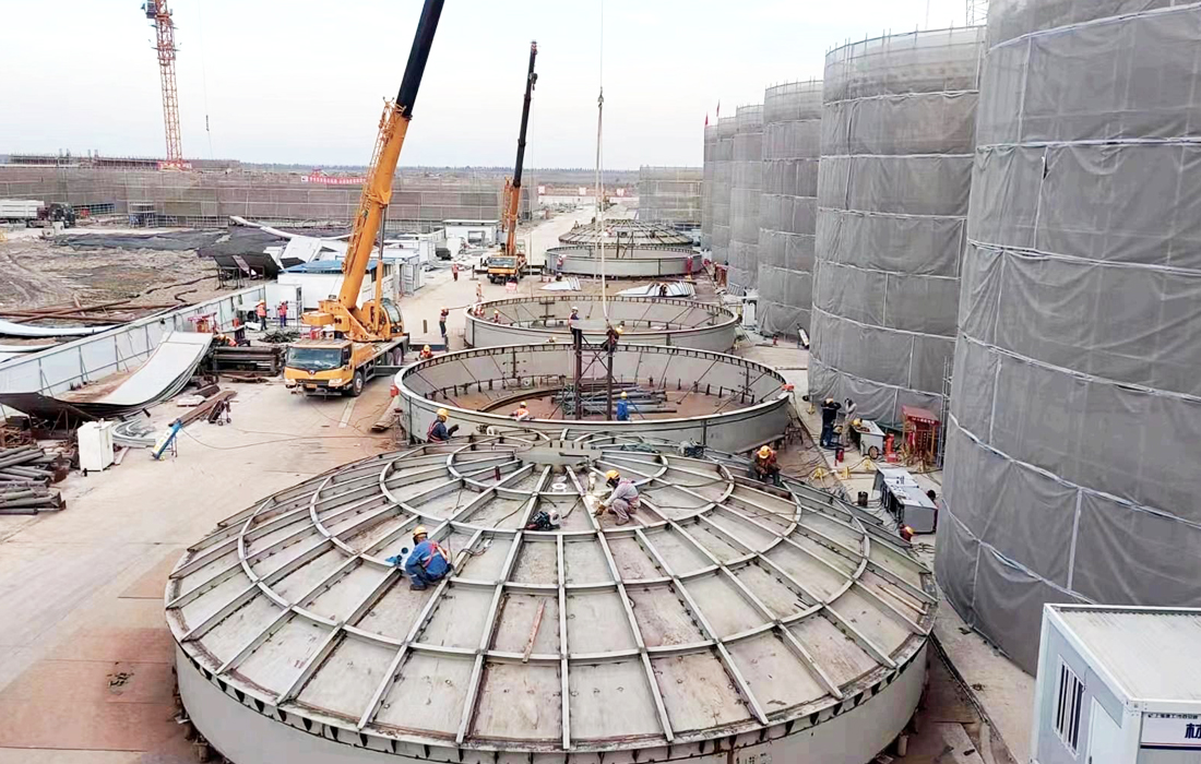 The third phase of the Shanghai Bioenergy Reutilization Project is located in Laogang Town, Pudong New Area. At present, its main processing objects are wet waste, including food waste from restaurants and kitchen waste. Its service area covers the central urban area of Shanghai and the southern area of Pudong New Area. It consists of 12 steel-structured tank cones with a diameter of 15 meters and a height of 30 meters and several connecting corridors. The total solid weight of each dry anaerobic tank is more than 200 tons. The total amount of steel used in the entire project reaches more than 2,200 tons, and it covers an area of approximately 5,500 square meters.
